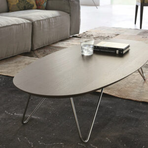 Senzatempo L 120 P 60 H 27 cm. tavolino da salotto ovale. Finiture: tutti i colori laccati opachi, laccati lucidi e laccati poro aperto. Struttura in metallo cromato.