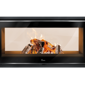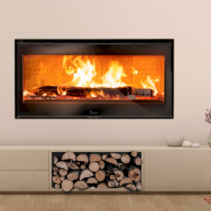 Camino a pellet angolare destro. Dimensioni vetro generose, grande fiamma grazie al doppio bruciatore visibile da diverse angolazioni.Doppio ventilatore centrifugo superiore con la possibilità di canalizzazione aria fino a 6 metri di distanza con tubo diam. 80 mm. Un ventilatore viene gestito in automatico in base alle potenze di caduta pellet, l’altro è gestibile dal cliente attraverso il telecomando. Un camino a pellet di elevato design.